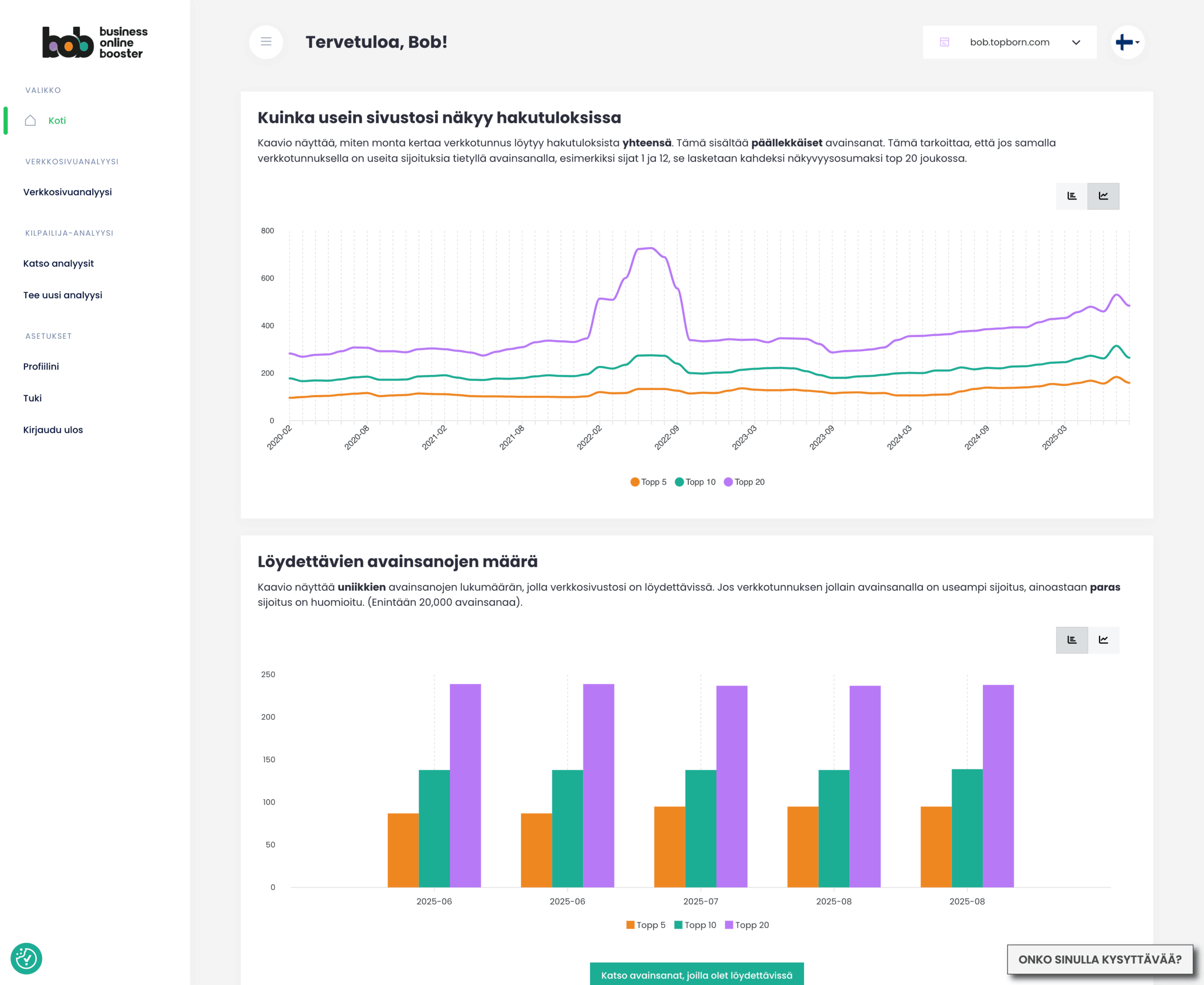Bob tarjoaa sinulle oivaltavaa tietoa verkkosivustostasi ja sen verkkosuorituskyvystä. Saat yleiskuvan siitä, kuinka monella avainsanalla olet näkyvissä, kuinka usein näyt hakutuloksissa ja miten näkyvyytesi kehittyy ajan myötä. Portaali tarjoaa myös tilastoja kävijämääristä, sitoutumisajasta sekä siitä, kuinka moni on tehnyt sivustolla jonkin tietyn toimenpiteen, kuten täyttänyt lomakkeen tai vastaavaa.